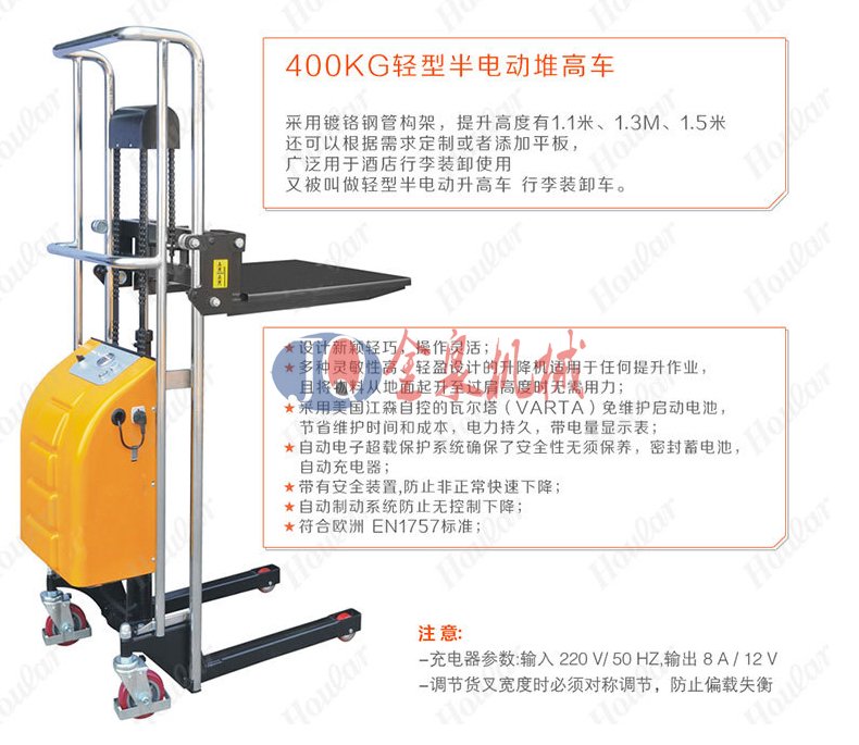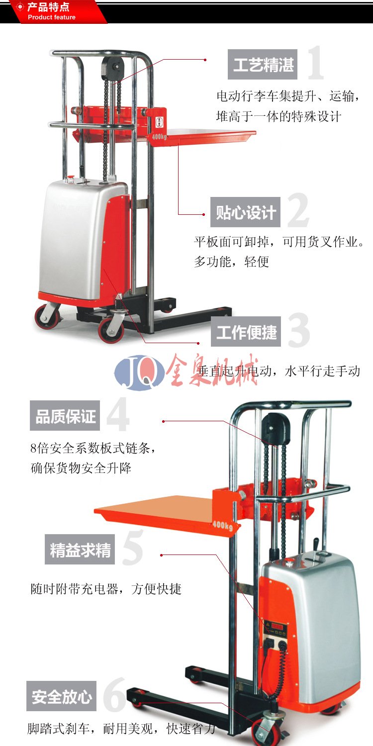 金泉輕型半電動堆高車采用:1.高品質電動泵站,操作輕巧省力 2. 免維護電池,電池持久,3.帶電量顯示 4.車架多層鍍鉻工藝,美觀耐用 5. 內置式充電口,充電方便安全
