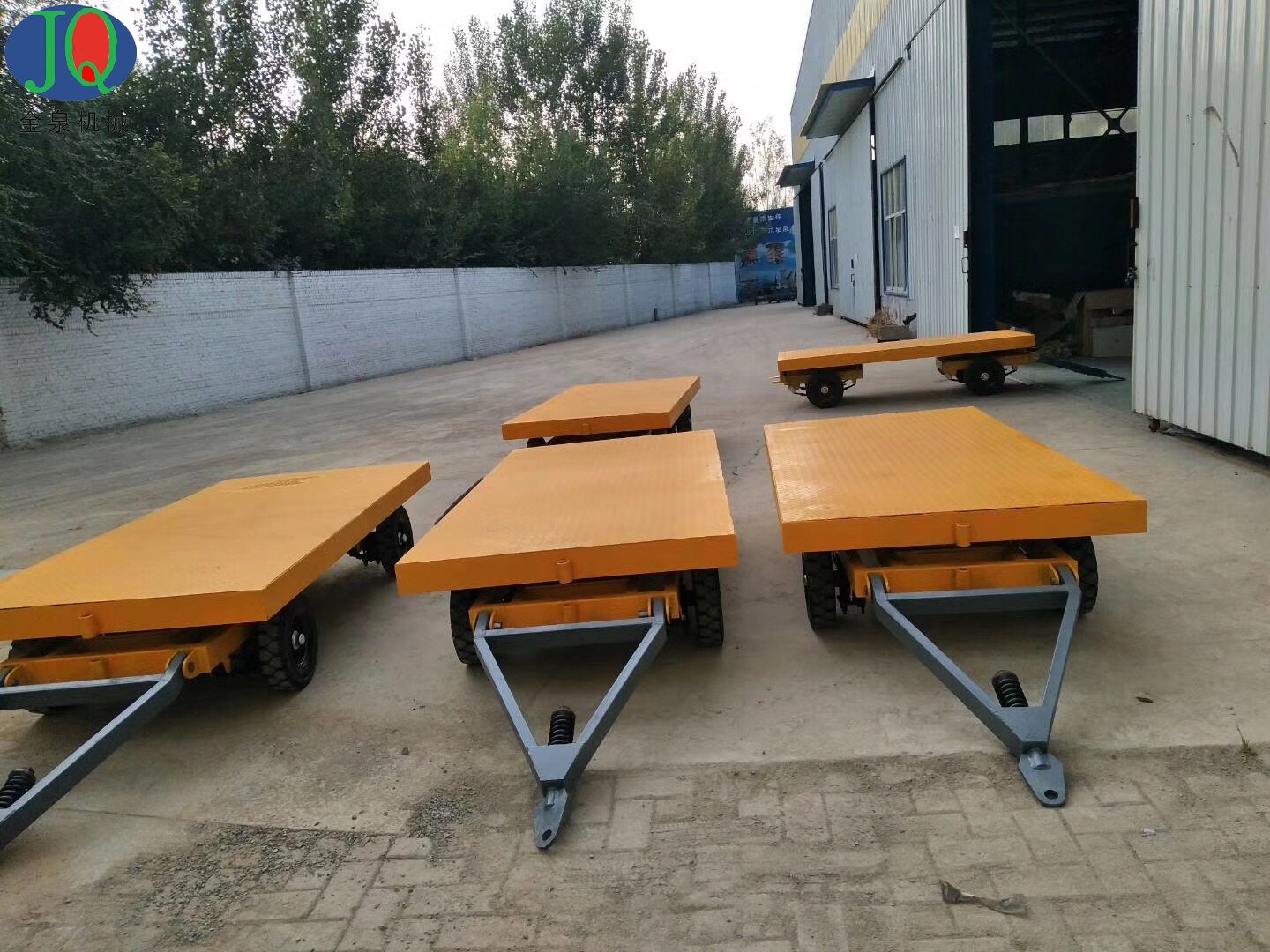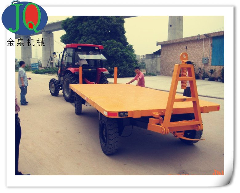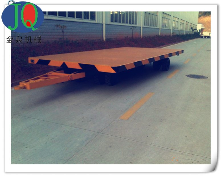 平板車一般采用充氣式實心輪胎,板面高度低、裝載量大。無破胎、爆胎的危險。安全、簡單而耐用。他自身無動力,需要又牽引車或者叉車來進行拖帶。通常由一輛或多輛平板車和一臺叉車或牽引車組成一列車輛來進行貨物平面運輸或大型設備的搬運工作。廣泛應用于機場、港口、火車站、工廠和大型倉庫。大大的提高了貨物中轉(zhuǎn)平移的效率。減少叉車和人力的消耗成本。