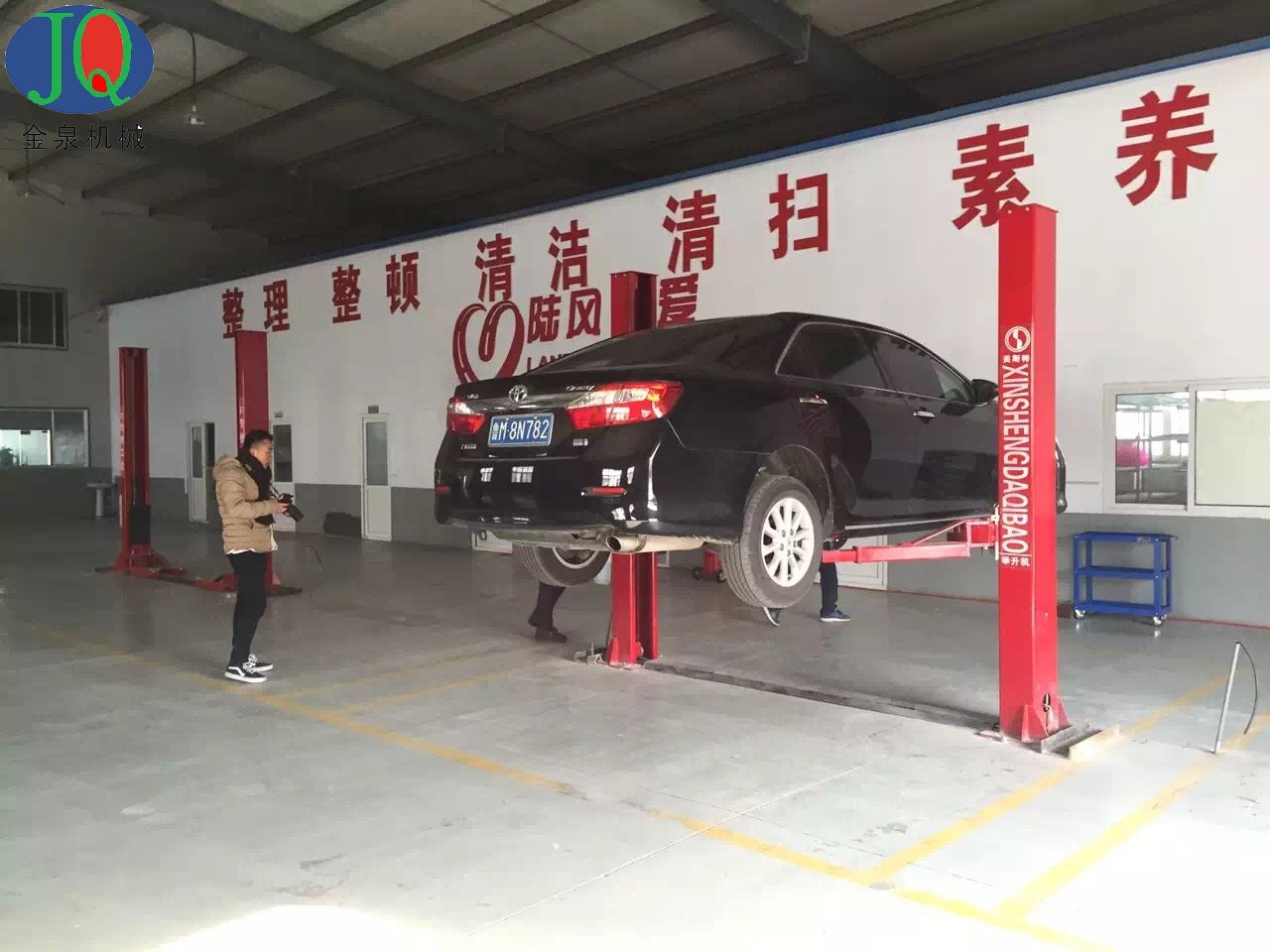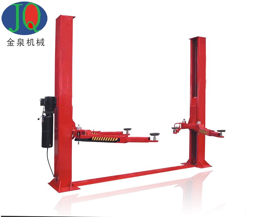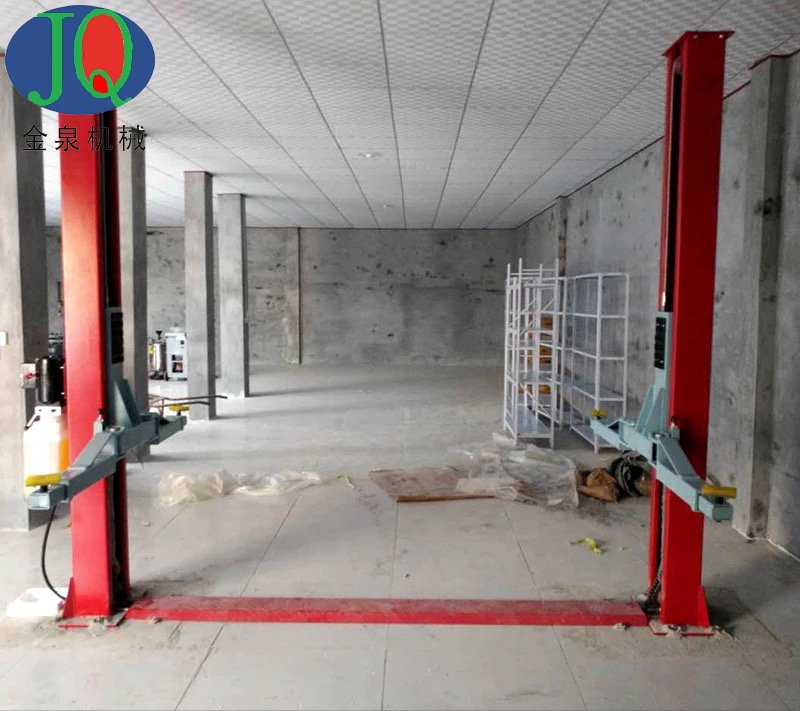 雙柱式汽車舉升機是一種汽車修理和保養(yǎng)單位常用的專用機械舉升設(shè)備,廣泛應用于轎車等小型車的維修和保養(yǎng)。雙柱式汽車舉升機將汽車舉升在空中的同時可以節(jié)省大量的地面空間,方便地面作業(yè)。但是雙柱式汽車舉升機為了最大的節(jié)省材料,一般都去掉了底板。由于沒有底板,使得立柱的扭力需要靠地面來抵消,所以對地基要求很高,若是有橫梁(龍門舉升機)就靠橫梁抵消。