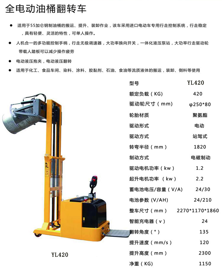 | YL420 | 420 | 250/80 | 聚氨酯 | 電動 | 站駕式 | 1820mm | 電磁制動 | 1.2kw | 2.2kw | 24/30 | 24/210 | 2270*1170*1860 | 135 | 120 | 2300 | 1150 |