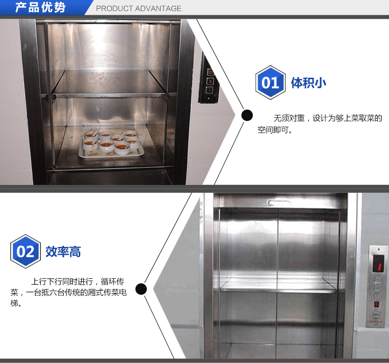 2.效率高:上行下行同時(shí)進(jìn)行,循環(huán)傳菜,一臺(tái)抵六臺(tái)傳統(tǒng)的廂式傳菜梯。