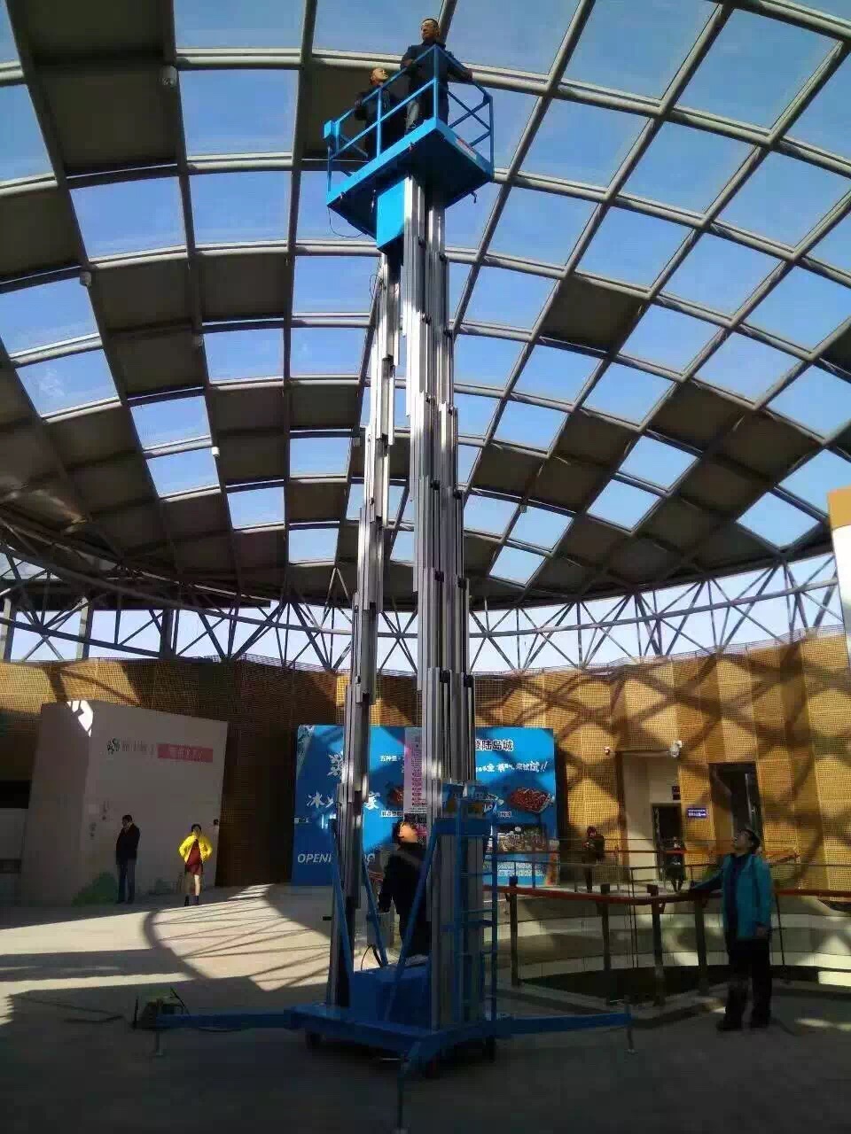單柱鋁合金升降機(jī):該系列產(chǎn)品為室內(nèi)型,廣泛適用于星級酒店,大型超市等各行業(yè)大廳、廠房內(nèi)的高空作業(yè), 具有升降平衡,操作方便,能進(jìn)入一般門廳,可隨意進(jìn)出電梯且耗電少、無污染、工作時(shí)不傷 地面,可用于 貼墻工作及探出作業(yè),工作無死角。單立柱式鋁合金電動(dòng)升降機(jī)配上龍門跨架附件,非常適合于影劇院、會(huì)堂、教堂等的維修工作。該龍門跨架組裝容易,操作省力,移動(dòng)靈活,可跨越高度達(dá)1.1m的固定座椅等障礙物,并可在臺階上穩(wěn)定 作業(yè)。高強(qiáng)度矩形鋼管制作,剛性、穩(wěn)定性好。配有萬向腳輪,機(jī)動(dòng)靈活。兩端架跨距可調(diào),能適 用于跨越不同障礙物的要求。兩端架垂直可調(diào),可用于一定坡度的斜面或臺階上作業(yè)。